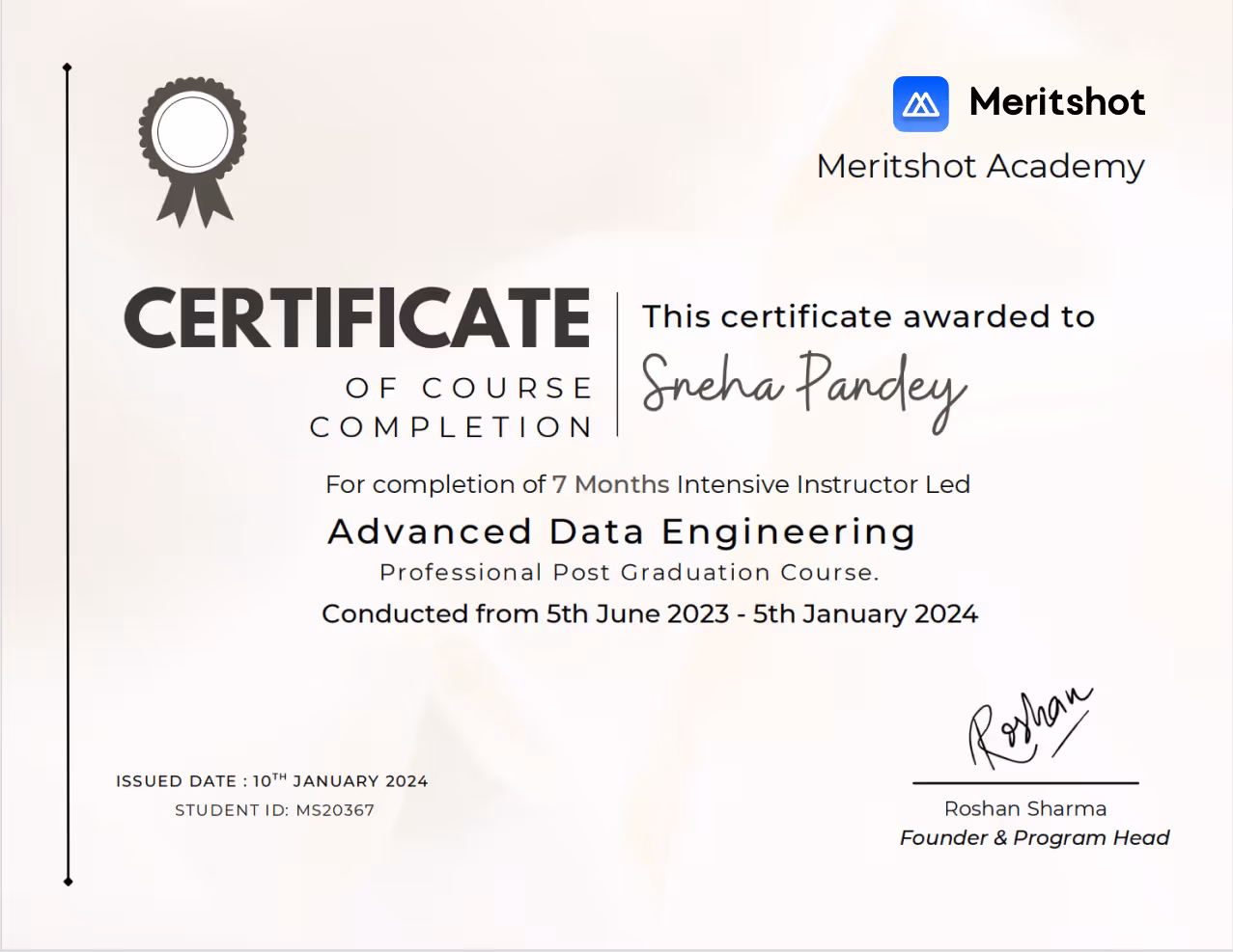 A: Yes. Upon completing the program, you’ll earn an official Meritshot Data Engineering Program Certificate & Microsoft azure data engineer certificate recognized by recruiters and hiring partners.