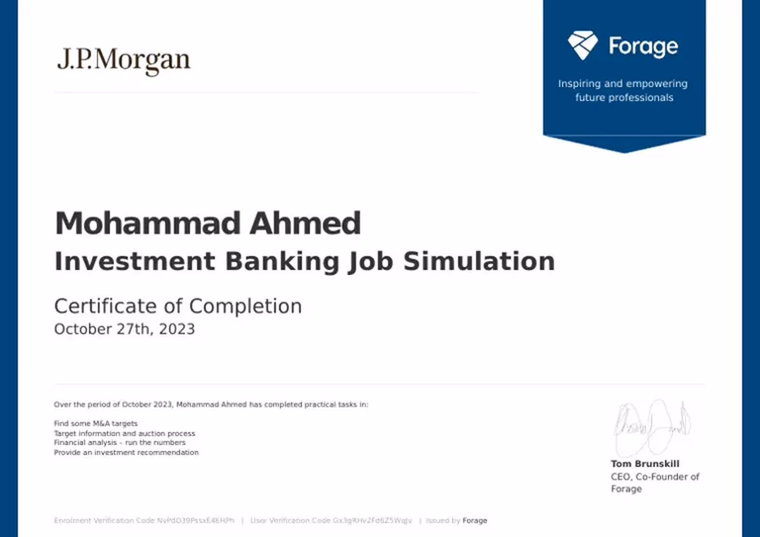 Earn Meritshot completion certificate and JP morgan accredited certificate that is globally recognized, employer-trusted, and shareable on LinkedIn to showcase your Investment Banking expertise.