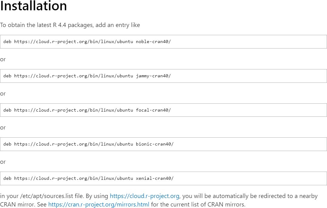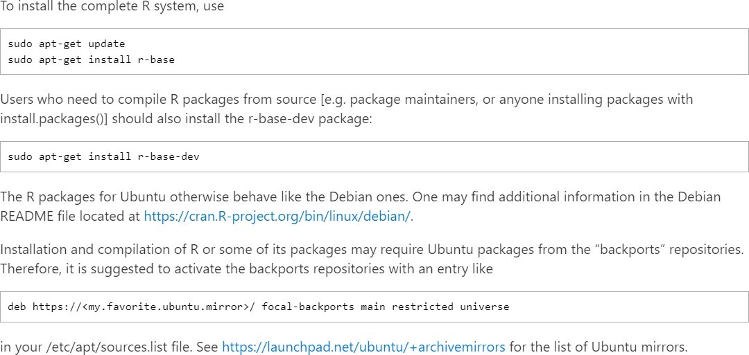 To install R, either we can get it from the site https://cloud.r-project.org or can use commands from the terminal.